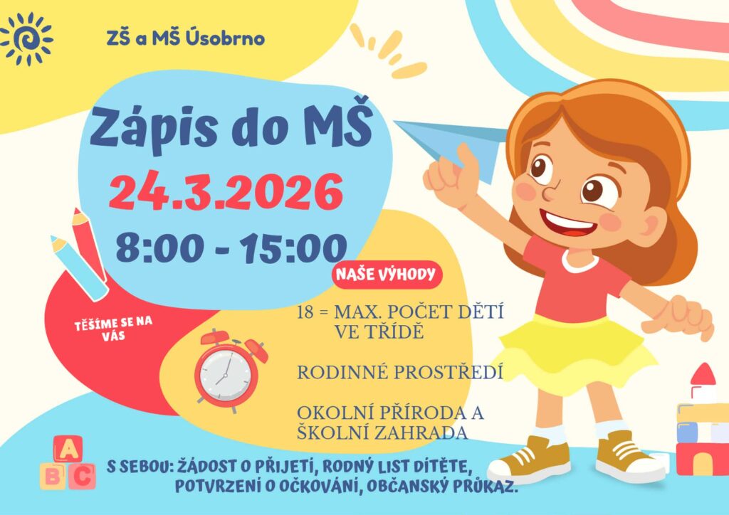 Zápis do 1. ročníku ZŠ se uskuteční ve čtvrtek 22.1.2026 v budově školy v 15.00 hodin. S sebou občanský průkaz a rodný list dítěte.